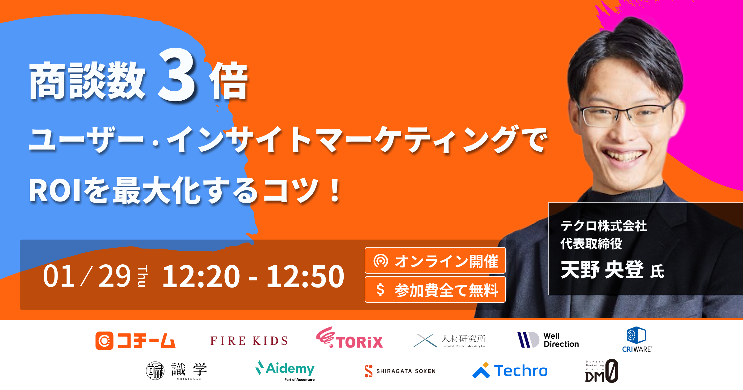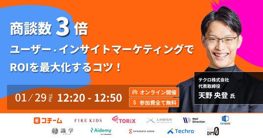 本カンファレンスは2日間にわたって開催され、全15社が登壇。当社は1/29(木)12時20分より、「【商談数3倍】ユーザー・インサイトマーケティングでROIを最大化するコツ!」というテーマで代表取締役の天野が登壇いたします。