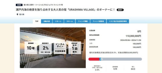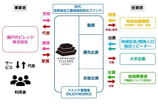 株式会社エンジョイワークス(本社:神奈川県鎌倉市、代表取締役:福田和則、以下「エンジョイワークス」)は、香川県三豊市・ソーシャルプロジェクトファンドの第一弾となる「URASHIMA VILLAGEプロジェクト」をスタートします。これは、瀬戸内ビレッジ株式会社(本社:香川県三豊市、代表取締役:古田秘馬、以下「瀬戸内ビレッジ」)が香川県三豊市で所有し宿泊施設として運営する「URASHIMA VILLAGE」を、当社が展開する地域活性ローカルファンド「ハロー! RENOVATION」が投資家を募集するSPC(合同会社三豊地域活性化ファンド)にて購入し、同社にリースバックする事業で、地域に根ざしたビジネスの新しいEXITモデルとする取り組みです。当ファンドは、本日9月6日(木)15:00から投資家募集開始となります。