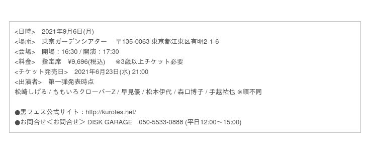 9月6日に「黒フェス2021~白黒歌合戦~」が行われる「東京ガーデンシアター」のみならず、「ホテル ヴィラフォンテーヌ グランド 東京有明」、「ショッピングシティ 有明ガーデン」、「天然温泉 泉天空の湯」など、有明ガーデン各施設にて開催される「黒フェス in有明ガーデン」にもご期待ください。