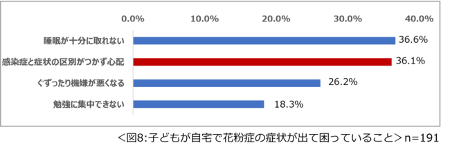 「お子さまが自宅で花粉症の症状が出て困っていることは何ですか」という問いに複数選択で答えてもらったところ、約4割の人が「睡眠が十分に取れない」「感染症と症状の区別がつかず心配」と回答しました(図8)。