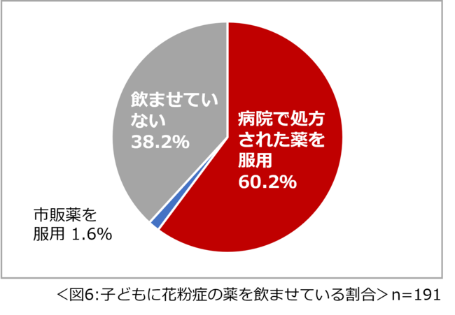 12歳以下の花粉症の子どもを持つ方に「花粉症の薬を飲ませていますか」と質問したところ、 約6割の人が「病院で処方された薬を服用」と回答「花粉症の薬を飲ませていない」人は約4割いました。
