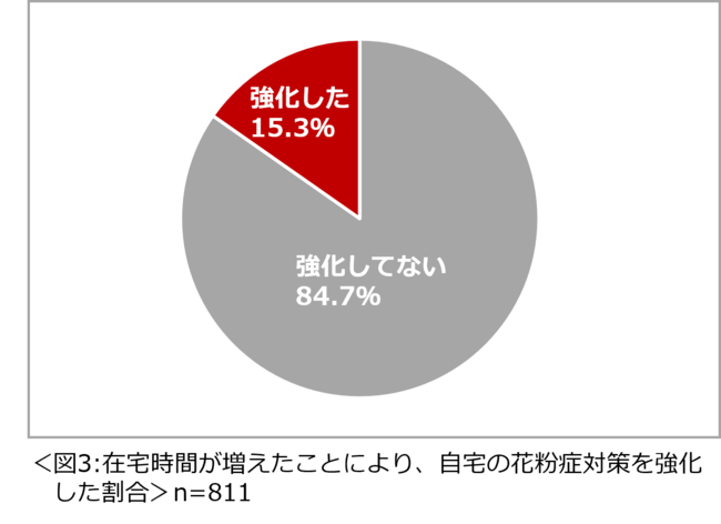 「コロナ禍3年目になり、在宅時間が増えたことで自宅での花粉症対策を強化しましたか」という質問に対しては、「強化をしていない」人が約85%と圧倒的に多く、「強化をした」と回答した人は約15%に留まるという結果になりました (図 3)。