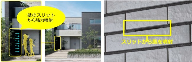 外壁タイルの目地部分にある8つの吹き出し口から、強力噴射のエアシャワーで花粉を取り除きます。洋服に付いた花粉の平均除去率は97%以上(※4)。大人も子どももスイッチひとつで、頭からつま先まで全身に付着した花粉を、キレイに吹き飛ばします。
