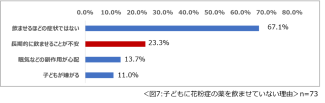 さらに「薬を飲ませていない」と回答した方に、薬を飲ませていない理由を複数選択で答えてもらったところ 、「飲ませるほどの症状ではない」と答えた方が 一番多く約67%でしたが、「長期的に飲ませることが不安」という方も2割以上おり、子どもの体への影響に不安を感じている方がいることがわかりました(図7) 。