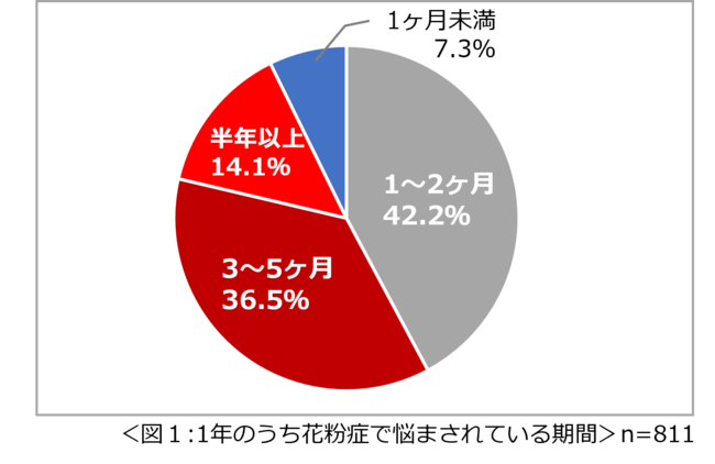 「1年のうちどのくらいの期間、花粉症に悩まされていますか」という質問をしたところ 、3ヶ月から5ヶ月と回答した人と、半年以上と回答した人を合わせると、1年の1/4以上の期間で花粉症に悩まされている人が半数以上いる ことがわかりました(図 1)。