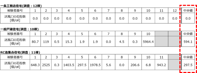 戸外から建物内へ流入する空気中に含まれる小さな粒子を、フィルターで除去する一条工務店の住宅の場合、居室へ供給された空気から花粉は検出されませんでした。しかし外気をフィルターで濾過せず、屋内へ取り込む構造の住宅では、給気口から空気とともに花粉が侵入することが、この度の検討で明らかになりました。