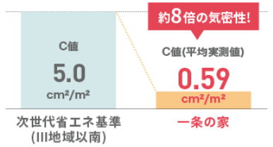一条の超気密構造は、国の定めた次世代省エネルギー基準の「C値1(※1)」である5.0cm² /m²をはるかに上回る 0.59cm² /m² (※2)をマーク。これは、一番寒さの厳しい北海道(I地域)の基準もクリアするほどの高性能です。