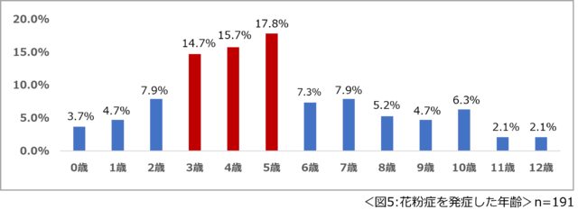 花粉症の子どもを持つ方に、「お子さまは何歳から花粉症を発症しましたか」と尋ねたところ、1位「5歳」、 2位「4歳」、3位「3歳」となり 、3~5歳までに発症したと回答した人が約半数いることがわかりました (図 5)。