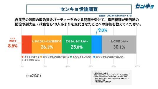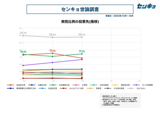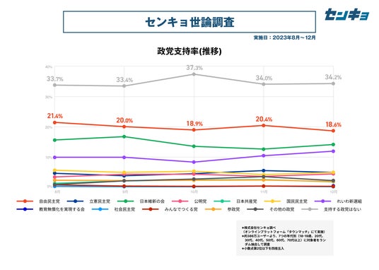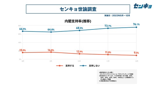 株式会社センキョ(所在地:東京都港区、代表取締役:堀 浩之)は、2023年8月より毎月、自社で運営する全国386万人余りの市民が参加するプラットフォーム「タウンマッチ」において、内閣の支持率や政党の支持率などを調査する「世論調査」を実施しています。政治に関する新たな調査データとして、政治関係者や有識者だけではなく、幅広く多くの方にご活用いただけますと幸いです。