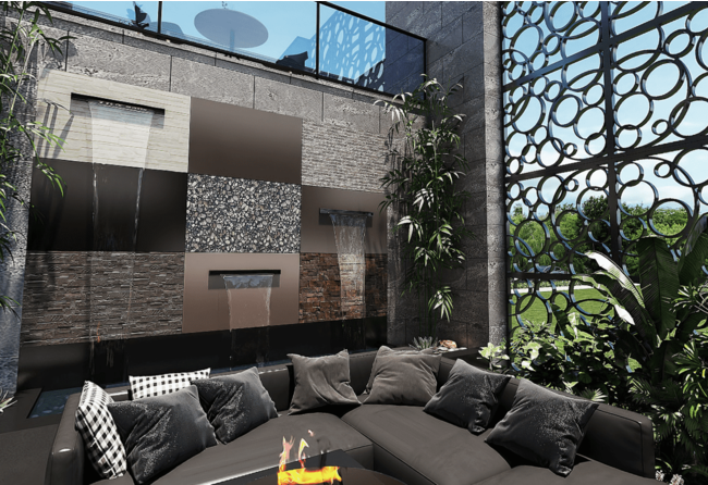 ライトコート=中庭。外からの光を適度に取り入れ、壁にはマイナスイオンを感じるへ壁泉を設置。リビングから続く空間と一体化したライトコートは、外からの目線を気にしないで食事をしたりできる、まるでもう一つのリビングのような使い方で楽しめます。