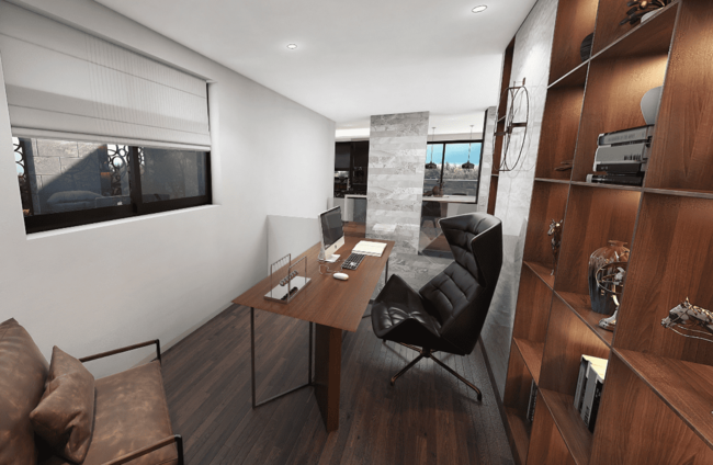 書斎は、お施主様のニーズに合わせたお部屋。テレワークなど集中できるスペースとしても利用できる空間としており、適度に家族の様子もわかる位置に配置している。
