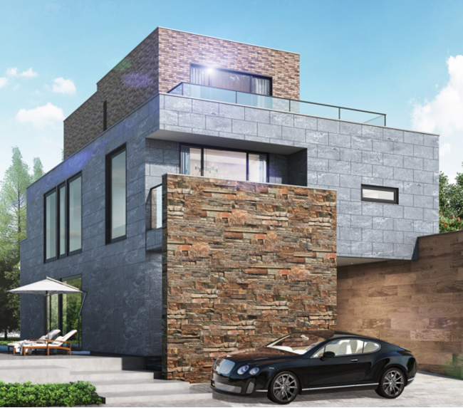 ヨーロッパ建築を得意としたノウハウを活かした新しい「ラグジュアリーモダン」スタイル。優れた耐久性と強靭な耐震性を誇る「乾式工法パネル構成材」で外壁に天然石をホールドした壁面を実現。繊細でナチュラルな表情が建物に優美な高級感を演出し、上品なテイストを活かした美しい住まいづくりを実現。