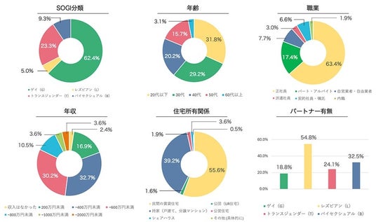 今回の回答者のSOGIの分類では、「ゲイ」が最も多く、その次に「トランスジェンダー」「バイセクシュアル」と続き、「レズビアン」が最も少ない分布でした。パートナーの有無の観点で見た場合、「レズビアン」は他のSOGIよりも「パートナーあり」の回答比率が高く、一部の設問の回答傾向に影響を与えている可能性があります。