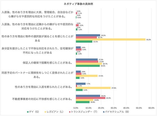 住宅探しにおけるネガティブな経験の中心は「性のあり方を理由にした物件の減少」「保証人の確保の困難」「企業の差別的対応」の3つ。