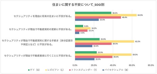 「将来の住まい」「不動産契約に関する手続き」「不動産業者に行く」の3つで不安を感じる人が多いことがわかりました。こちらに関しても、レズビアンとトランスジェンダーにおいて特に高い比率を示しています。