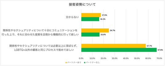 「関係性やセクシュアリティについては必要以上に深ぼらず、LGBTQ+以外の顧客と同じプロセスで進めてほしい」はパートナーの有無によらず高い傾向ですが、「関係性やセクシュアリティについて十分にコミュニケーションを行った上で、それに合わせた提案を店側から積極的に行って欲しい」では「パートナーあり」の方が「パートナーなし」に比べ求められる傾向が見られました。