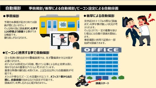 「録画をしておけば良かった!」が解消できます。この機能は録画ボタンを押した2分前までさかのぼり撮影する事が出来ます。また衝撃感知機能にて自動撮影された場合でも、2分前より録画されるため、トラブルの一部始終を録画する事ができます。
