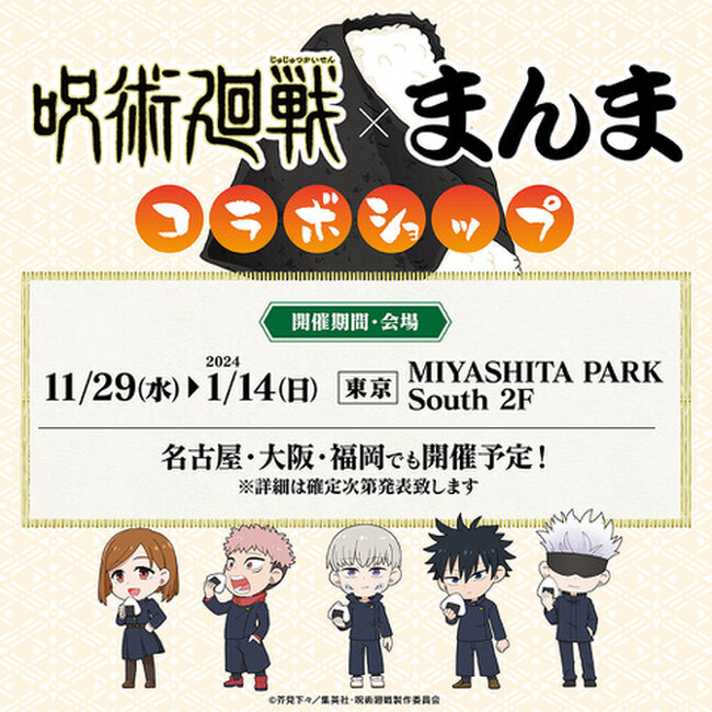 株式会社WIZARD(代表:古角将夫 本社:東京都千代田区)は、人気TVアニメ「呪術廻戦」と、新宿のおにぎり専門店「まんま」とのコラボポップアップショップを開催します。11月29日(水)から東京、渋谷のMIYASHITA PARKからスタートして、名古屋・大阪・九州と巡回して開催を予定しております。