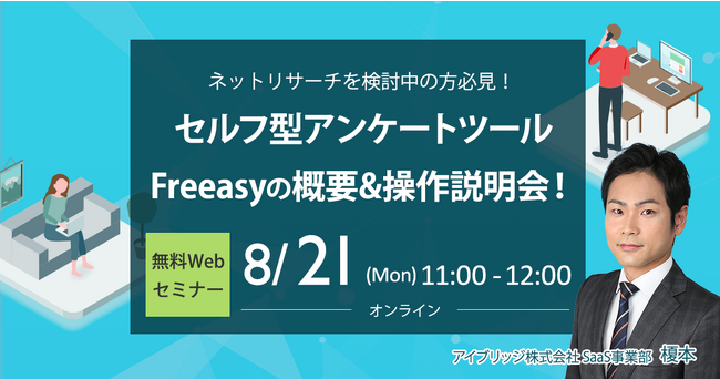 全国1,300万人の調査モニターへ500円からネットリサーチが行えるセルフ型アンケートツール“Freeasy(フリージー)”を展開するアイブリッジ株式会社(本社:大阪市福島区、代表取締役社長:荒川和也)は、『ネットリサーチを検討中の方必見!無料オンラインセミナー「セルフ型アンケートツールFreeasyの概要&操作説明会」』を2023年8月21日(月)11時から開催いたします。
