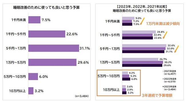 「睡眠改善のために使っても良いと思う予算」を聞いたところ、回答の多かった順に「5千円~1万円未満」(31.1%)、「1万円~5万円未満」(29.6%)、「1千円~5千円未満」(22.6%)という結果でした。2020年の調査以降で1万円未満の割合が減少する一方、5万円以上と回答する人の割合は増加しています。快適な睡眠に対する投を重要視する人が増えていると推察ができます。
