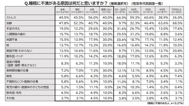 「睡眠に不満がある原因は何だと思いますか?(複数選択可)」の質問では、「ストレス」(49.5%)、「加齢」(47.8%)、「手足の冷え」(19.0%)、「人間関係の疲れ」(15.7%)、「体調不良」(15.5%)でした。第1回目の調査から毎回の調査で「ストレス」が最も多い回答となっています。