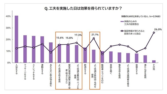 「快眠の工夫を実施した日は効果を得られていますか?」という質問に対し、「毎回快眠が得られる」と回答した人の割合が多かった項目は「より快適な掛布団・毛布を使用」(21.1%)、「より快適な敷布団・ベッドを使用」(17.3%)でした。寝室の環境や寝具などを改善することが効果的だと感じている人が多いことがわかります。