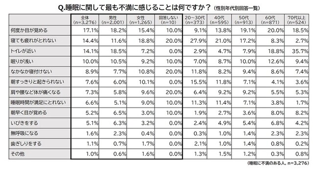 「睡眠に関して最も不満に感じることは何ですか?」と質問したところ、回答の多かった順に「何度か目が覚める」(17.1%)、「寝ても疲れが取れない」(14.4%)、「トイレが近い」(14.1%)、「眠りが浅い」(10.0%)、「なかなか寝付けない」(8.9%)という結果となりました。昨年2位だった「何度か目が覚める」が今回は1位という結果でした。性別・年代別に見ると、「寝ても疲れが取れない」は女性や若い人に多い傾向があるようです。反対に男性に多かったのは「トイレが近い」という回答で、年齢が上がるにつれ割合も高くなっています。