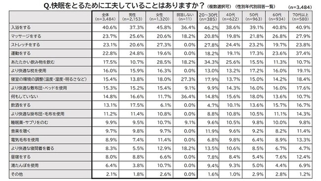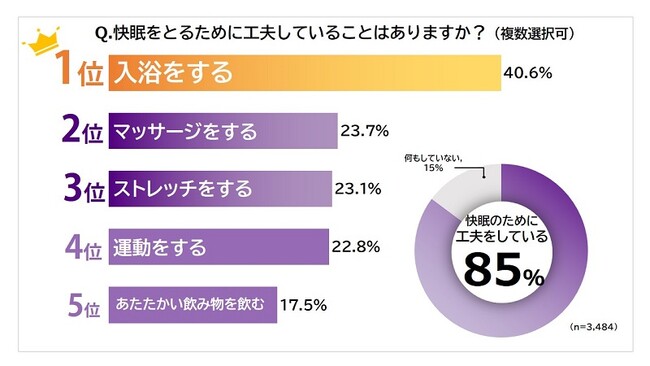 回答者全員に「快眠をとるために工夫していることはありますか?(複数選択可)」と質問したところ、工夫しているという回答は85%でした。具体的には多かった順に「入浴をする」(40.6%)、「マッサージをする」(23.7%)、「ストレッチをする」(23.1%)、「運動をする」(22.8%)、「あたたかい飲み物を飲む」(17.5%)です。