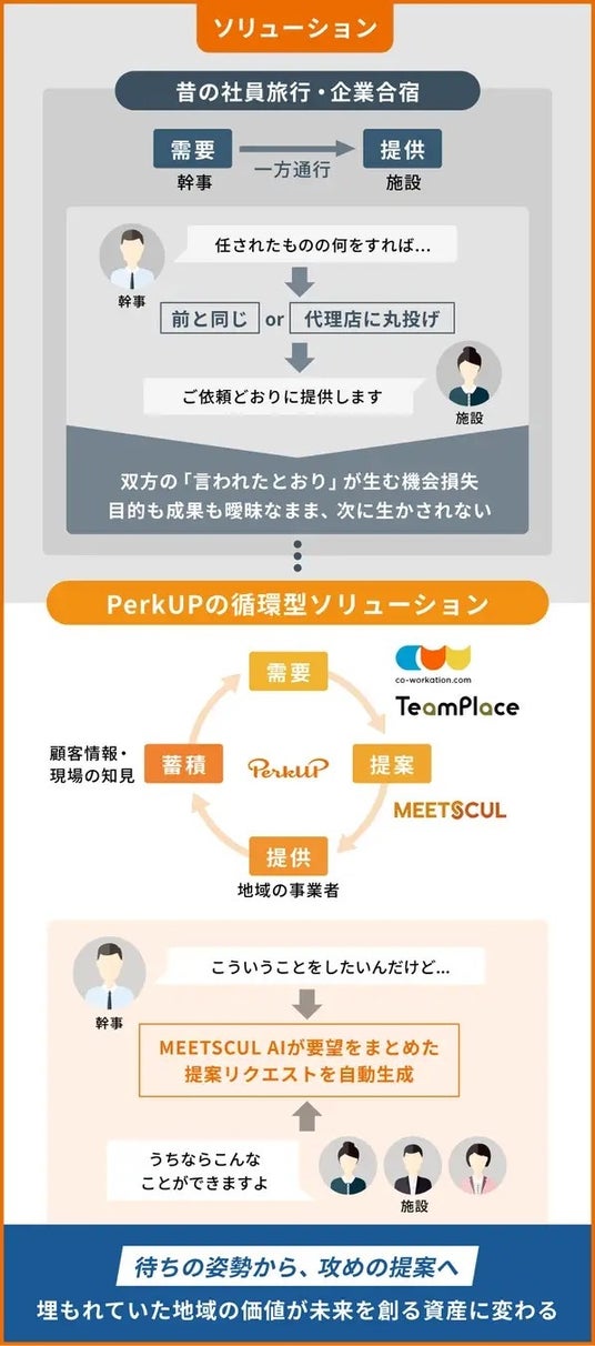 PerkUPは、「旅が未来を豊かにする世界」をビジョンに掲げ、「人と地域の出会いを科学する」をミッションとして、法人向け合宿、オフサイト研修、ワーケーションなどの場をつなぎ、新しい出会いや学びの機会を創出しています。