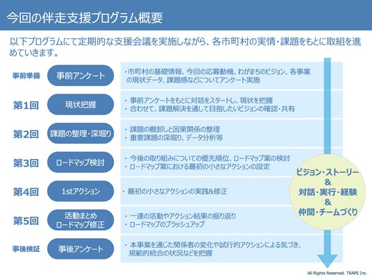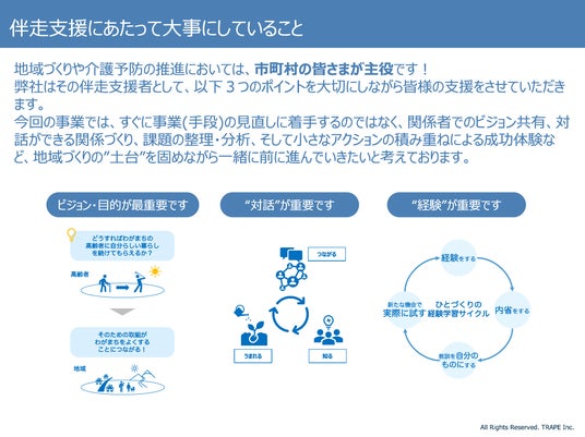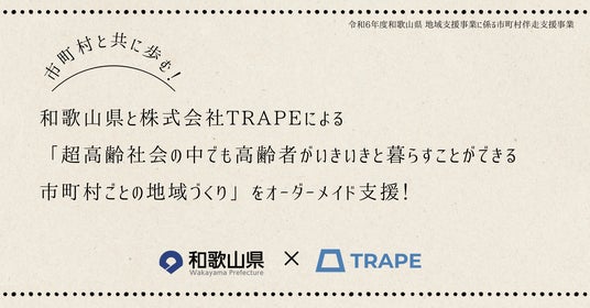 「素敵な役割のあふれる日常を創る」をビジョンに掲げ、令和4年度に厚生労働省の老人保健事業「都道府県による市町村支援に活用するための支援パッケージ策定に係る調査研究」に取り組み、全国の市町村のwell-beingな地域づくりを後押しする「地域づくり支援ハンドブックvol.1.0」を作成するなどwell-beingデザインを通じて人々、組織、地域に新たな可能性や価値を提供してい株式会社TRAPE(本社:大阪府大阪市、代表取締役社長:鎌田大啓)は、この度令和6年度和歌山県「地域支援事業に係る市町村伴走支援業務」における業務委託契約を和歌山県様と締結して、和歌山県内の市町村ごとの現状と課題に応じたオーダーメイドの伴走支援事業を実施することとなりました。