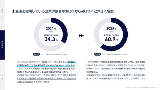 ウェビナー経由で月1件以上の受注を実現している企業の割合が、2024年の34.3%から2025年には60.9%へと大幅に増加しました。これはウェビナーが単なる「認知・リード獲得の場」から「実際の受注を生み出す営業チャネル」へと進化していることを明確に示しています。