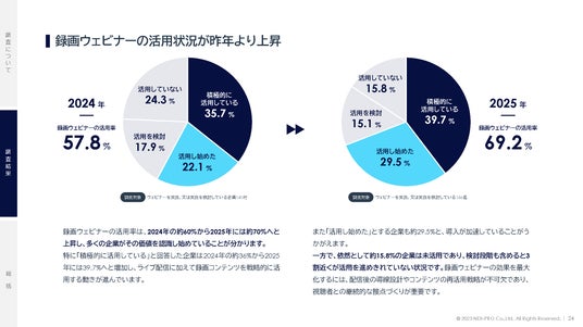 録画ウェビナーを「積極的に活用している」または「活用し始めた」企業は69.2%に達し、昨年の約57.8%から上昇しました。ライブ配信のアーカイブや録画コンテンツの戦略的活用が進んでいます。