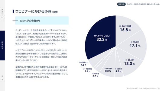 ウェビナー運営は76.5%の企業が1-2人体制で実施しており、月間予算も「全くかけていない」(32.2%)や「10万円以下」(32.9%)といった低コスト運営が多数を占めています。効率的なリソース活用でウェビナーを実施する企業が主流となっています。