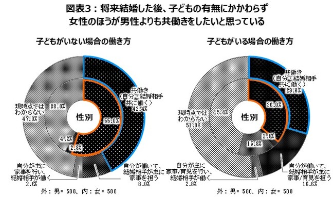 - 男子(42.4%)より多くの女子(55.0%)が「共働き(自分・結婚相手共に働く)」を選んでおり、女子の共働きへの意欲が高い(図表3)。