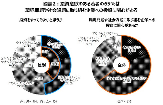 - 投資への意欲がある若者(n=435)のうち、環境問題や社会課題に取り組んでいる企業への投資の意欲を持つ若者は、全体の65.0%である(図表2)。