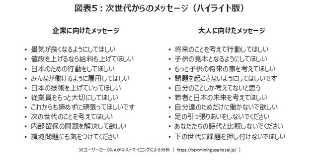 「次世代からのメッセージ」として企業に向けたもの、大人に向けたものの2種類を自由記述で設定し、回答結果全文についてAIテキストマイニング(※)を実施したところ、それぞれの特徴的なコメントがハイライトされて抽出された(図表5)。