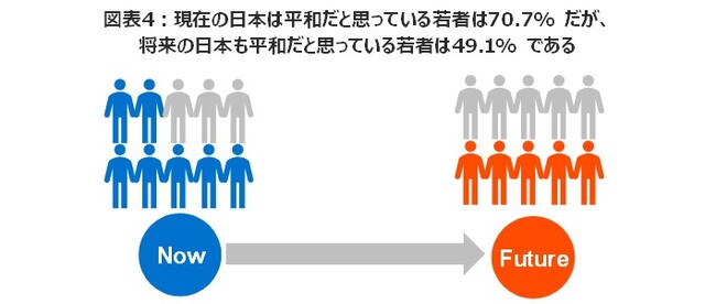 - 「現在の日本は平和である」と思う若者は全体の70.7%である一方、「将来の日本は平和である」と思う若者は全体の49.1%である(図表4)。