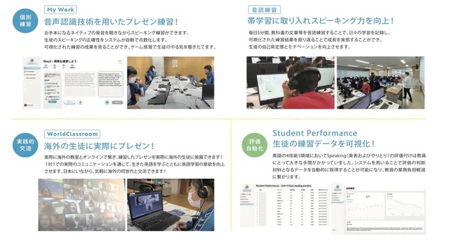 WorldClassroomとは、音声認識技術等を用いたスピーキング練習機能や世界中の同世代との国際交流機能が実装された英語教育DXクラウドシステム。