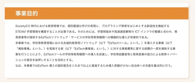経済産業省が学校教育機関へのEdTechツール導入を支援するために行う事業。EdTechツールの導入補助により学校及び教育委員会と教育産業の協力による教育イノベーションを後押しします。
