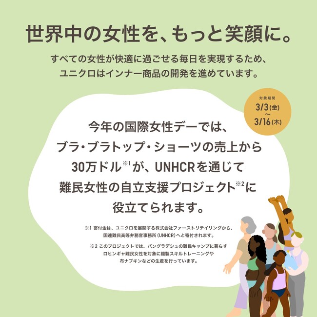ファーストリテイリングは、2023年3月8日(水)の国際女性デーに合わせ、グループブランドであるユニクロ、ジーユーの商品のうち、ブラ、ブラトップ、ブラフィール、ショーツの売り上げから30万ドルを、国連難民高等弁務官事務所(UNHCR)を通して、バングラデシュの難民女性の自立支援プロジェクトへ寄付します。