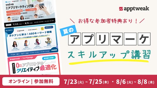 アプリストア特化型マーケティングプラットフォームを提供するAppTweak Japan合同会社(本社: ブリュッセル、ベルギー、代表: Olivier Verdin、以下「AppTweak」)は、アプリのユーザー獲得施策であるASO対策の基礎が習得できる夏季特別キャンペーン「夏のアプリマーケスキルUP講習」を開催します。