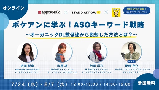 本セミナーでは、ASOツールを提供する「AppTweak」とASO支援サービスを提供する「StandArrow」の2社でアプリ担当者が陥りがちな失敗事例やキーワード選定のテクニックをご紹介するとともに、ポイ活アプリ「ポケアン」のアプリ担当者様をゲストに迎え、オーガニックDL数低迷からのDL数復活・向上に成功したASO戦略の秘訣を伝授していただきます!