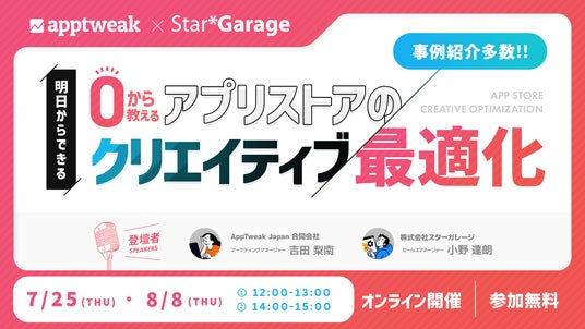本セミナーでは、ASOツールを提供する「AppTweak」とASO支援サービスを提供する「スターガレージ」の2社で、ストアクリエイティブ最適化のやり方やベストプラクティス、上級者向けのテクニックを、具体的な成功事例とともにご紹介します。