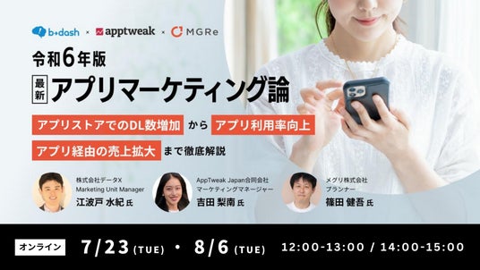 本セミナーでは、アプリのユーザー獲得プラットフォームを提供するAppTweak、理想的な顧客体験を実現するアプリプラットフォームを提供するMGRe、ノーコードで「データの取り込み・加工・統合・抽出・活用」ができるデータマーケティングツール「b→dash」を提供するデータXの3社が、2024年のアプリ戦略を強化するためのノウハウをご紹介いたします。