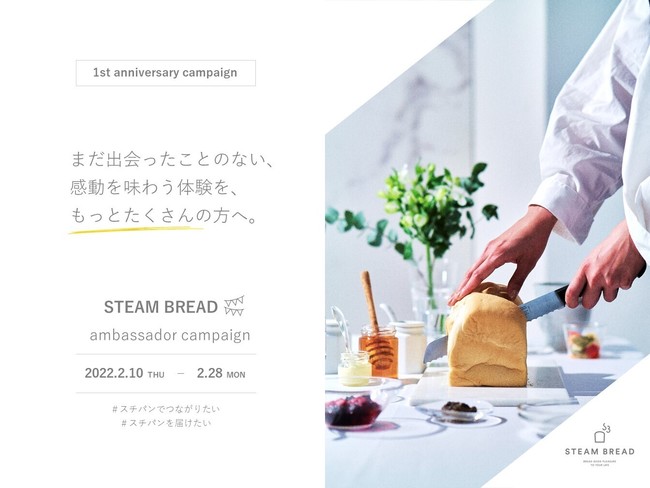 株式会社アシスネット(本社:神奈川県横浜市)が展開する日本初のスチーム生食パン専門店「STEAM BREAD」は、2022年2月をもって、ブランドローンチから1年を迎えます。日頃、支えてくださっているみなさまへの感謝の気持ちと、このSTEAM BREADを通した感動体験をより多くの方にお伝えしたく、“この感動をもっとたくさんの方に”「STEAM BREAD 1st Anniversary」を開催致します。それに伴い、STEAM BREADと相性の良いプロダクトとコラボレーションし、ペアリングを提案する「STEAM BREAD pairing」や、過去の人気商品「STEAM BREAD FRUIT SAND」も復刻いたします。また、魅力をSNSで発信いただき、STEAM BREADを一緒に盛り上げていただくアンバサダーを募集する「STEAM BREAD アンバサダーキャンペーン」を実施します。