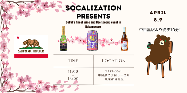 フードカルチャーを通じて "SOCAL"(ソーキャル=南カリフォルニア) のリラックスしたライフスタイルを提案するソーキャリゼイション株式会社 (以下、ソーキャリゼイション/本社:東京都目黒区、代表取締役:白神 襲之) は、2023年4月8日と9日(土日)、中目黒は目黒川沿いのスペースにて、桜のもとで南カリフォルニア産のワインやクラフトビールなどのお酒が楽しめるイベントを開催します。このイベントは同社がミッションとしている「一度きりの人生、楽しく生きる"SOCAL(ソーキャル)=南カリフォルニア" ライフスタイル」啓もう活動の一環として行うものです。来場者にはSOCALライフスタイルを日々実践することをイベント後も思い出せるように、同社のマスコット「ソーキャルモン」のオリジナルステッカーが配られます。