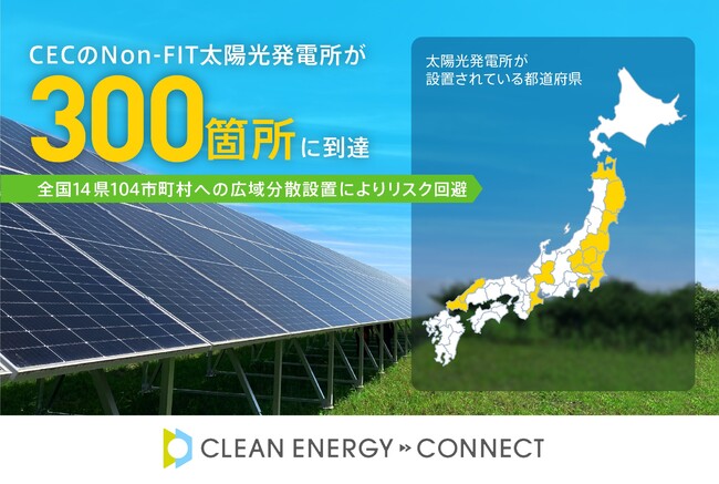 脱炭素経営企業、RE100参加企業等のお客様に対してNon-FIT太陽光発電によるグリーン電力と環境価値をお届けする株式会社クリーンエナジーコネクト(代表取締役:内田鉄平、以下「クリーンエナジーコネクト」)は、発電を行っているNon-FIT太陽光発電所が、合計300箇所になりましたのでお知らせします。