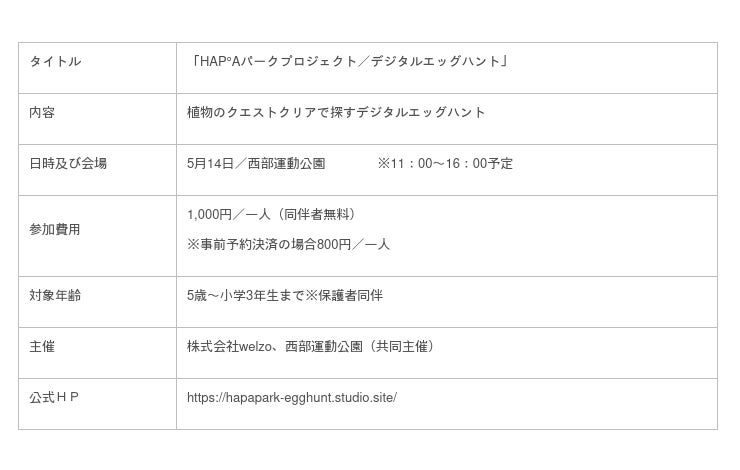 農園芸のイノベーションカンパニーである株式会社welzo(本社:福岡県博多区/代表取締役社長 金尾佳文)は、5月14日(日)、西部運動公園(福岡県福岡市西区)において、植物をもっと身近に感じられる「HAP°Aパークプロジェクト/デジタルエッグハント」を実施します。