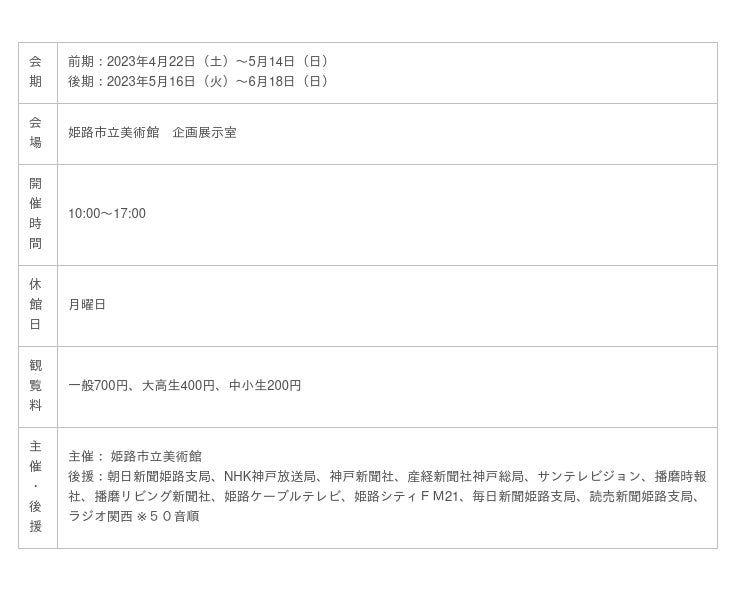 姫路ゆかりの美術工芸から同時代の美の動向を表すデザインや現代美術まで、近現代美術を中心に幅広いジャンルを網羅するコレクションは、「春の祭典」同様、革新性に満ちたそれぞれの時代を生きた人々の尊厳の表れであり、今を生きる私たちの生きるヒントとなるでしょう。