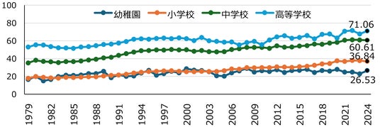 図1.:裸眼視力1.0未満の者の割合の推移(学校保健統計調査/年次統計 学校種別疾病・異常被患率等の推移(昭和23年度~令和6年度)より作成)